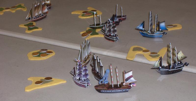 In the meantime, the Fire Blossom's ships had each claimed one coin (they were too full of crew to do any better); Richard's Aberdeen Baron had filled up her holds with gold, after which his entire fleet turned for home; Zach's ships had also made a gold run and were headed back for more; and Paul's fleet had closed to the center of the bay and was looking for trouble.