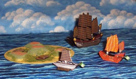 A Jade Rebellion fleet (the turtle ship Noble Swan and two junks, Sea Tiger and the enormous Grand Path) arrives from the east to examine the mysterious Humpback Island. |