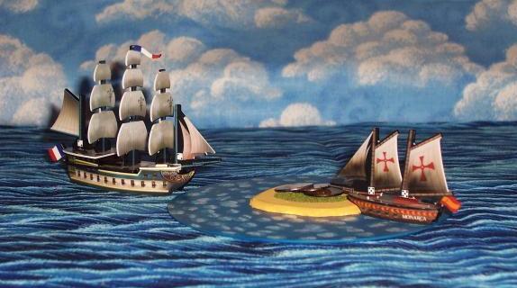 The big ship at left center is Mike's damaged USS Constitution, which is about to finish off Daniel's tiny Le Bon Marin. At the top is a cluster of two-masted derelicts - Paul's Cat's Claw, Richard's Sea Tiger and Rattlesnake, and Daniel's L'Intrepide. At right, Richard's big Bonhomme Richard engages Paul's fort, while Richard's Sea Rat maneuvers for position and Mike's USS Mercury (submerged) prepares to ram. Paul's pirate ship Treachery, minus its masts, is docked at an empty island at bottom left. See the battle report for this date to find out how we got into this mess. |