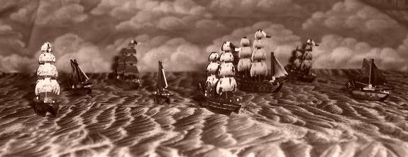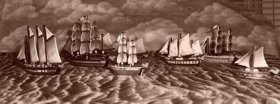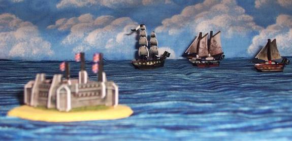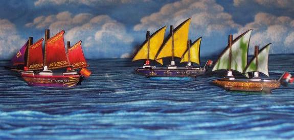 The Pirates are all about grabbing gold and getting it home. Their ships are inexpensive and quick; their cannons can be good, but rarely excel in battle. This eight-ship squadron cost only 30 points to build. |