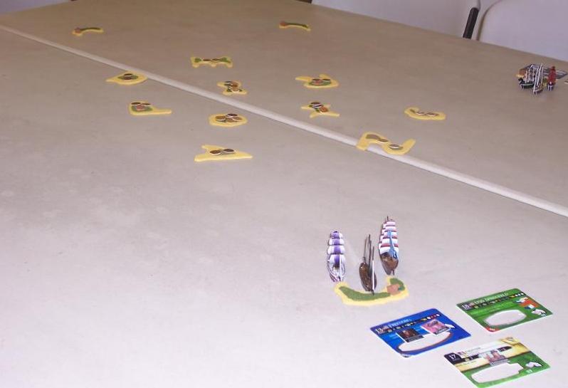 We built our fleets with ten masts and four crew each. The nine islands were arranged in a serpentine chain, with three treasures on each.