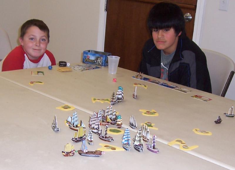 If Antonio had been a bit quicker to that last wild island, he would have come in second, even though he was down to one 2-masted ship. Zach won in part because Mike protected him from Jake, and in part because he kept his eyes on the gold and didn't get distracted by anything else. Our piratical group seems to have polarized into three sub-groups: the gold seekers (Antonio, Aimee, and Zach), the fighters (Mike, Jake, and Paul), and the indecisive (Richard). Mike has some interesting ideas for taking advantage of this in a future battle.