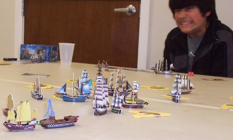 As the ships weighed anchor and set their initial courses, the admirals were wheeling and dealing for alliances. Jake and Paul wound up on the same side, and Richard and Zach may have been a team. Antonio urgently requested a deal from the Cadet-Captain, who stalled for time to see how the game might shape up. This caused the Almirante to cast some piratical trash-talk in Mike's general direction. "I say you're very scared."