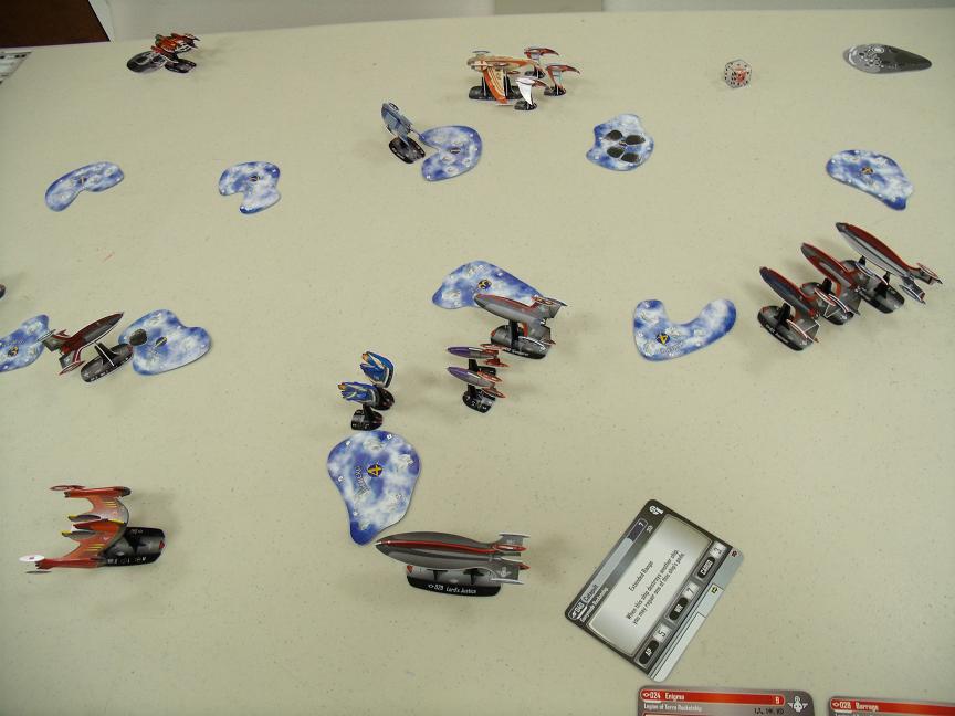 The battle ran out of time at this point. It surprised no one that Captain Redshirt won on points, since he was the only one to score any base hits at all, never mind take advantage of the base multiplier rule. In short, he played to win, while the others played to kill him, and everyone got what they wanted. But all that was left of his fleet was one podless fighter that was going to die next turn, if next turn ever came.