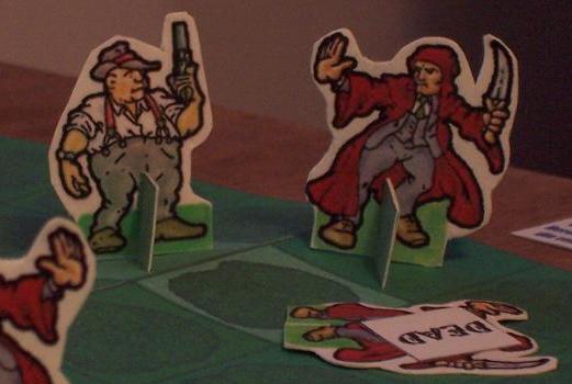 Both Peterowt and an Initiate tried to examine the interesting things they'd found, without success. The other two Initiates, hearing Big Floyd's gunshot, drew their ceremonial daggers and ran forward. One ran headfirst into Floyd, who had charged into action. Brownie, close behind him, got into a fight with the other red-robe.