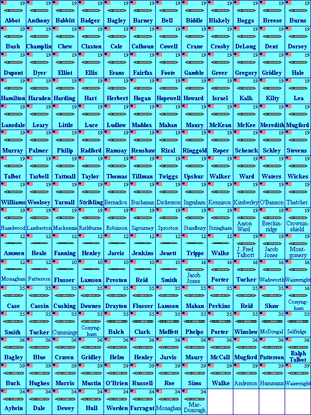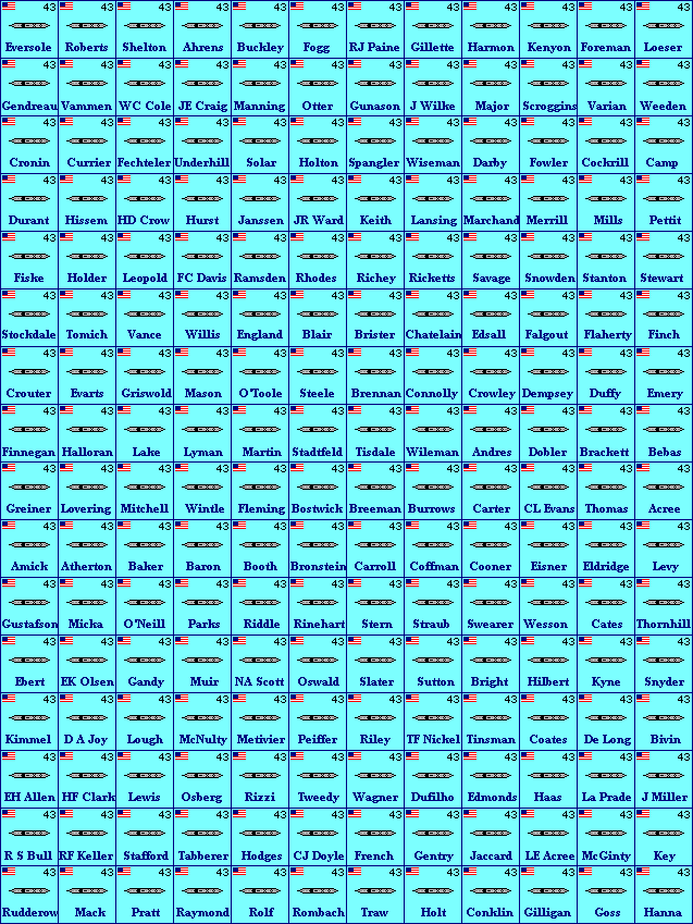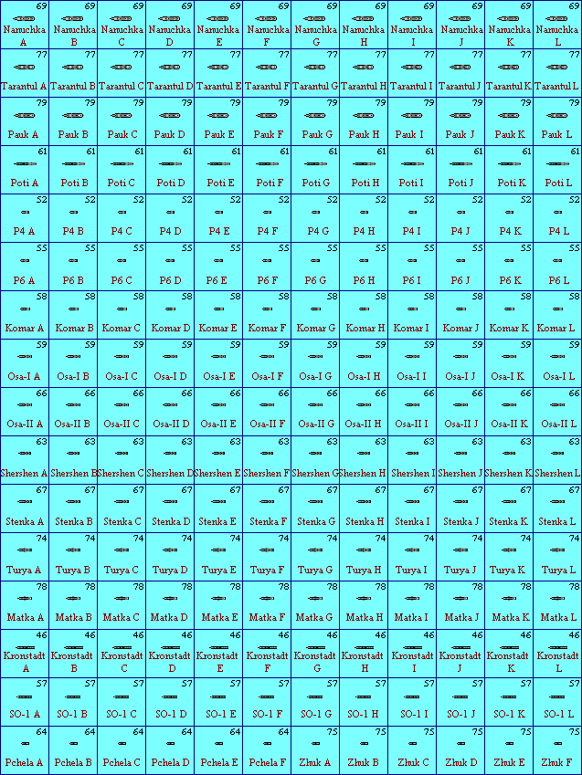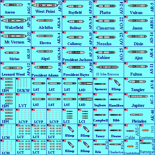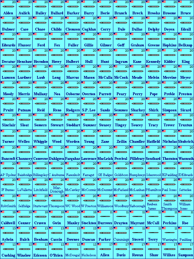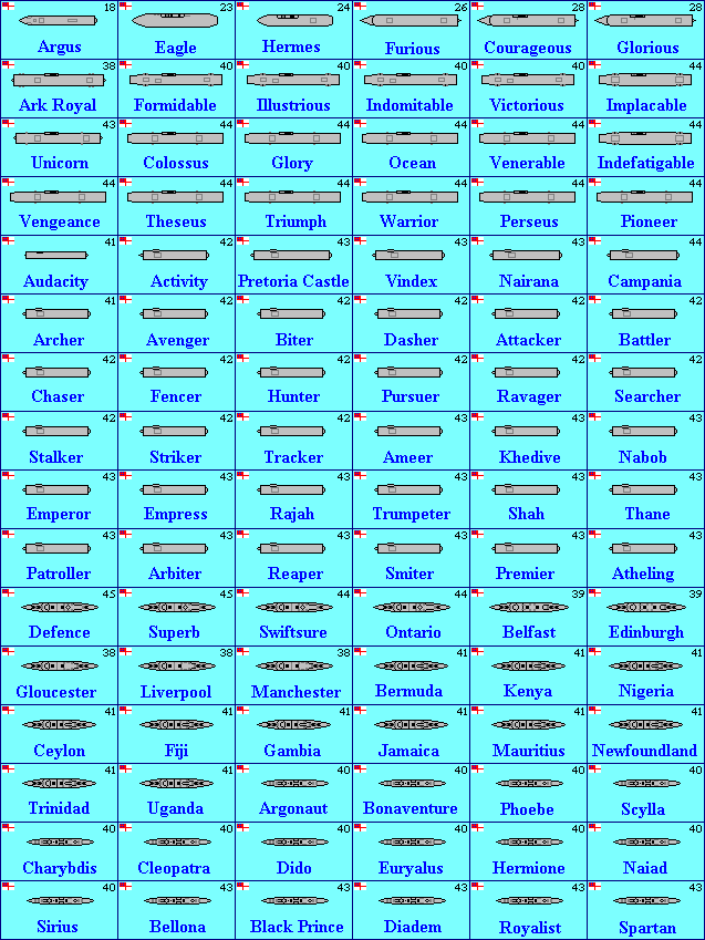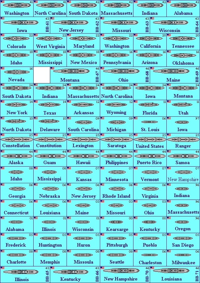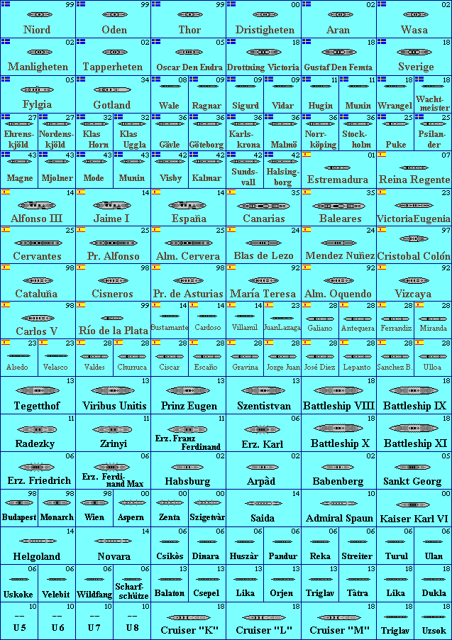 They're all to the same scale (roughly 1:9600, or 1 pixel = 8 feet). All ships are drawn as originally built. I used Conway's as my source for ship dimensions and completion dates, and Jane's for overhead views. Counters have a 2-digit year in the upper right corner, which is the year the first ship in that class became available. Some ships appear more than once, like ships that began life as one type but were converted to something else, or ships that were owned by more than one nation. If you dream of large naval battles, you probably already have a set of game rules in mind. But if you want a very simple set of rules that were written to take advantage of all these counters, my main games page has a game called EasyShip that might be what you're looking for. If at least two people request a particular navy or ship class, I'll try to add them. If you'd like to be notified when I put new ships on the site, e-mail me and ask to be added to my "All the Ships" mailing list. I'm indebted to Bob Smart, who is providing many pages of ships on his own initiative, and has improved on my own work in several areas. I'll happily cooperate with anyone else who wants to contribute to this project. 7554 ships in this project so far (not counting airplanes and airships) | ||