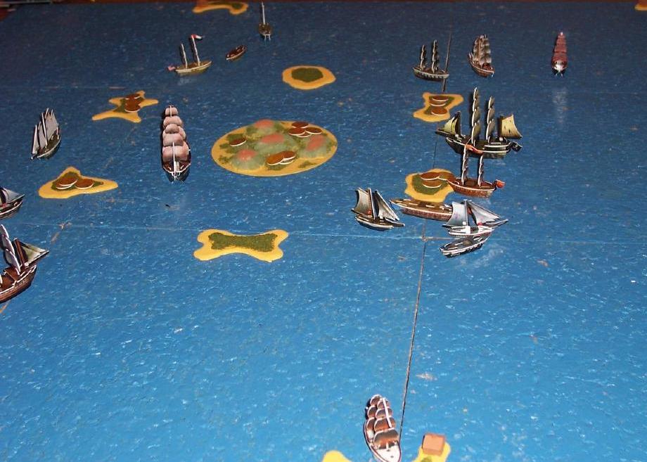 Richard's fleet, the large Bonhomme Richard and the small Lynx, enter the scene from the left; the sea monster Jormungandr is near the Lynx, but submerged. Just above the Lynx, Mike's Julius Caesar approaches, bows-on. In the next two turns, the Caesar will slay Jormungandr with one broadside, dismast the Lynx, grab the gold from the island nearby, and build a fort there. The large ship to the left of Humpback Island is Mike's Enterprise, which has just sunk Dave's La Monarca. Above the Enterprise is Mike's New Orleans, which is about to shoot past Dan's derelict Le Mercure and ram his Le Triton in order to bring her to Mike's home port. At top right are Dan's La Provence and La Baionnette, with Paul's red-sailed Bloody Jewel to their right. Paul's Cursed Blade and kraken Calypsos are out of sight to the right. The big black ship below Dan's ships is Lora's Shadow, with her La Furia just below it, docked at a wild island. Just below the island is the hulk of her La Santa Isabel, which has just been left derelict by Dave's Le Courageux (left) and La Cazadora (right) in revenge for her wrecking his HMS Apollo (just below La Cazadora). At the bottom of the picture is Dave's home island, with the Hades' Flame docked, having just returned with all the gold from Dogbone Island. See the battle report for this date for more information. |