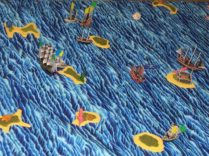 | This is what the end of a four-way, 45-point battle looks like. You can see the ocean fabric we sometimes use for a playing field, my home-made islands, and the Post-It flags we use instead of removing masts (to cut down on breakage). Dinosaurs guard most of the islands, but they played little role in the battle.