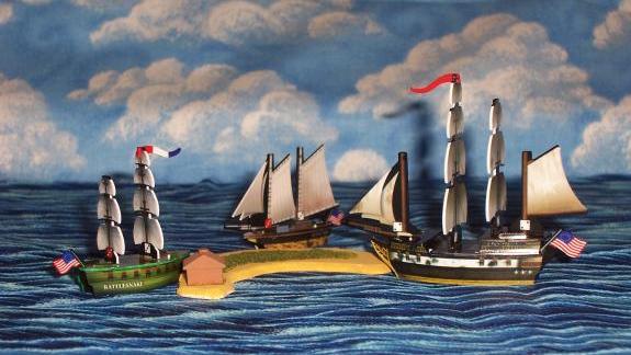 The big ship at left center is Mike's damaged USS Constitution, which is about to finish off Daniel's tiny Le Bon Marin. At the top is a cluster of two-masted derelicts - Paul's Cat's Claw, Richard's Sea Tiger and Rattlesnake, and Daniel's L'Intrepide. At right, Richard's big Bonhomme Richard engages Paul's fort, while Richard's Sea Rat maneuvers for position and Mike's USS Mercury (submerged) prepares to ram. Paul's pirate ship Treachery, minus its masts, is docked at an empty island at bottom left. See the battle report for this date to find out how we got into this mess. |