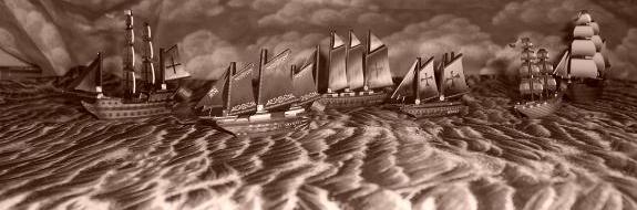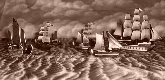 A Jade Rebellion fleet (the turtle ship Noble Swan and two junks, Sea Tiger and the enormous Grand Path) arrives from the east to examine the mysterious Humpback Island. |