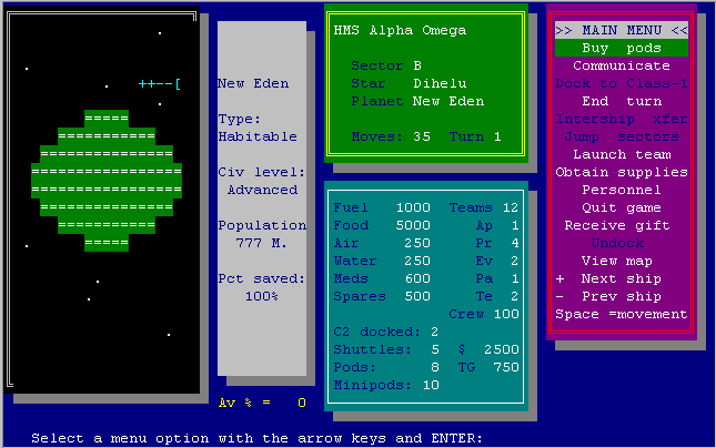 Crusade in the Cosmos sends you into the future. You have a small fleet of ships and a handful of willing church planters. Your task: to evangelize the galaxy! You'll have to contend with persecution, space pirates, and natural disasters, as well as maintaining supplies for your ships; you may get a visit from an angel, or one of your churches may send you a much-needed love offering. Can you win souls on the dreaded DarkStar?